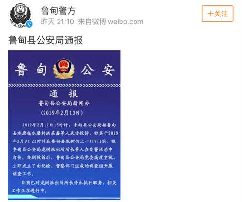 昨天(13日),云南省鲁甸县公安局官方微博@鲁甸警方 发布通报表示,接到当事人投诉后已成立调查组,目前当事所长已停职。